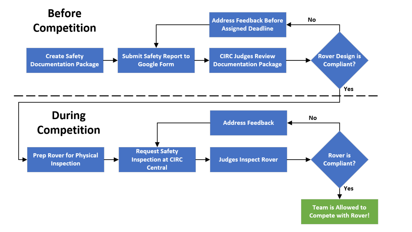 - Teams must compile a safety documentation package to prove their Rover design meets the Safety Requirements and submit it to this Google Form by June 19, 2026.